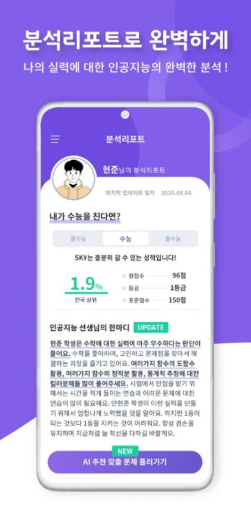 이 모든게 무료!! ■인공지능으로 미래의 수능 성적을 예측 해보세요! 10~15분만 문제를 풀면 인공지능이 여러분의 실력을 즉시 분석해 드립니다! 수능 성적 / 미래 대학교 / 전국 등수 / 약한 유형