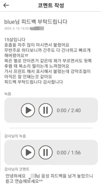 ▶ 너무 좋아요! 노래 녹음한 거 올리면 보컬 트레이너분들이 피드백해주시고요 부족한 점이나 조언받을 수 있습니다!^^