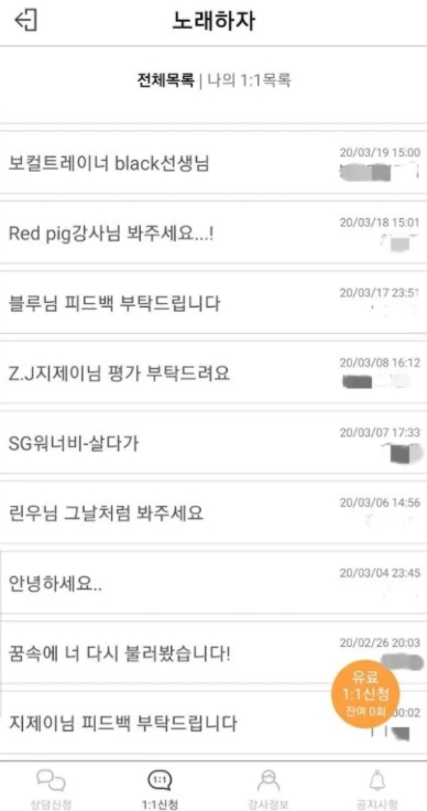 4. 좋아하는 보컬 트레이너의 오른쪽 상단에 있는 1:1 버튼을 클릭하세요!