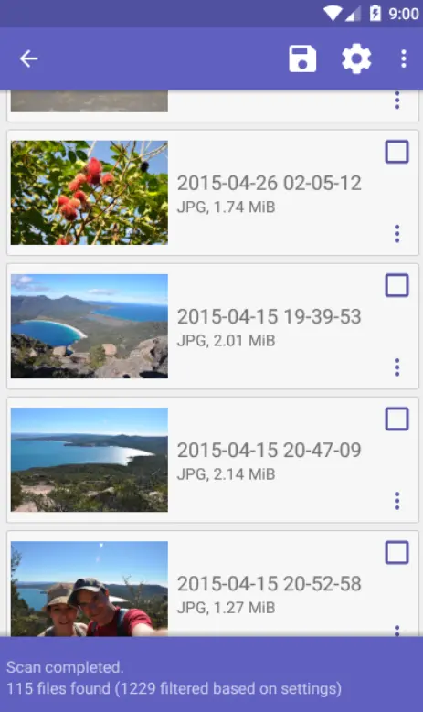 * 기기가 루팅되지 않은 경우 앱은 캐시와 썸네일을 검색하여 삭제된 사진에 대해 "제한된" 검사를 수행합니다.