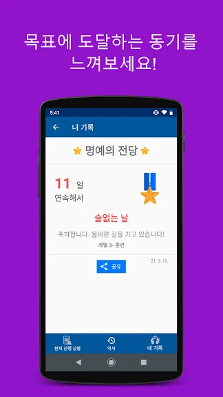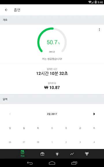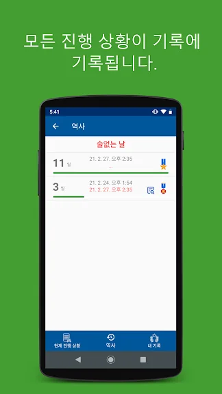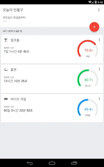 나쁜 습관을 끊으려 노력하고 자신의 진행 과정을 분석하세요! 나쁜 습관을 마지막으로 했던 정확한 날짜 및 중독에 일반적으로 소비한 돈이나 시간에 대한 정보를 추가하시고, 이를 출발점으로 사용하세요. 계속 진행하면서, 이것에 관한 수많은 흥미로운 통계를 받으실 수 있습니다. 절제 시간과 절약한 돈이 주요 통계에 나타납니다.