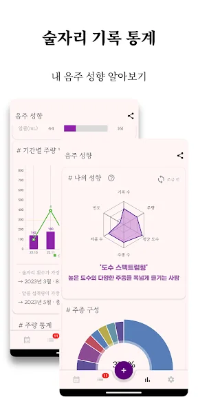 다른 사용자분들과의 상대 비교 성향, 내가 마신 주종의 구성 비율, 기간별 주량 및 횟수, 기타 정보를 알 수 있어요.