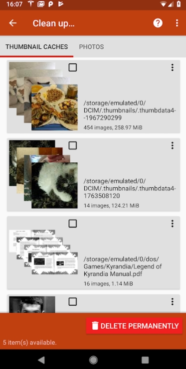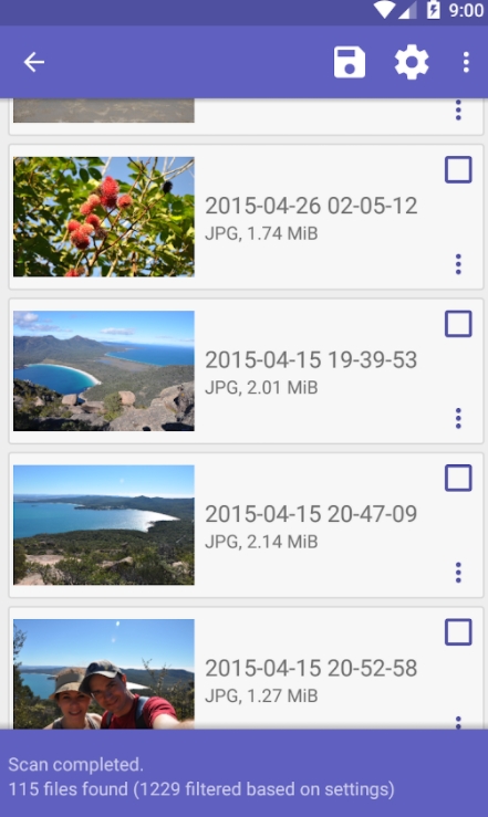 * 기기가 루팅되지 않은 경우 앱은 캐시 및 미리보기 이미지를 검색하여 삭제 된 사진에 대해 '제한적'검색을 수행합니다.