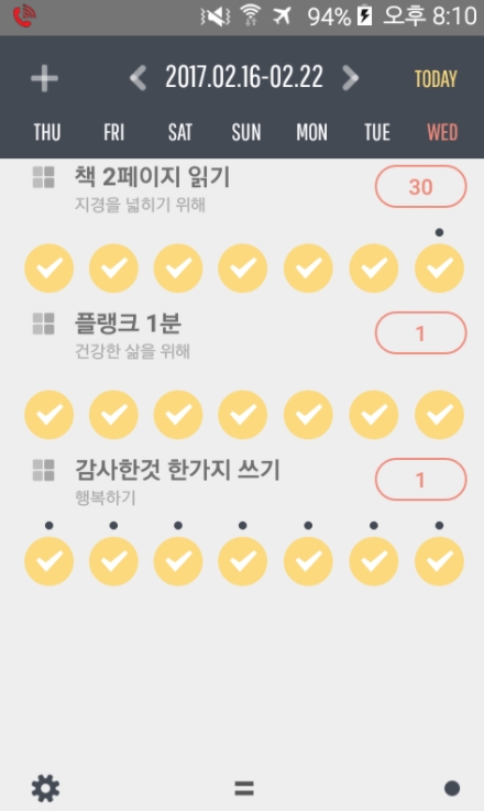■ 일주일 단위 습관 관리 : 습관은 일주일 단위로 잘 지켜 수행하는지 관찰하는 것이 좋습니다. 만약 실패한 습관이 있다면 목표가 높을 수 있습니다. 더 낮은 목표로 수정이 필요합니다.