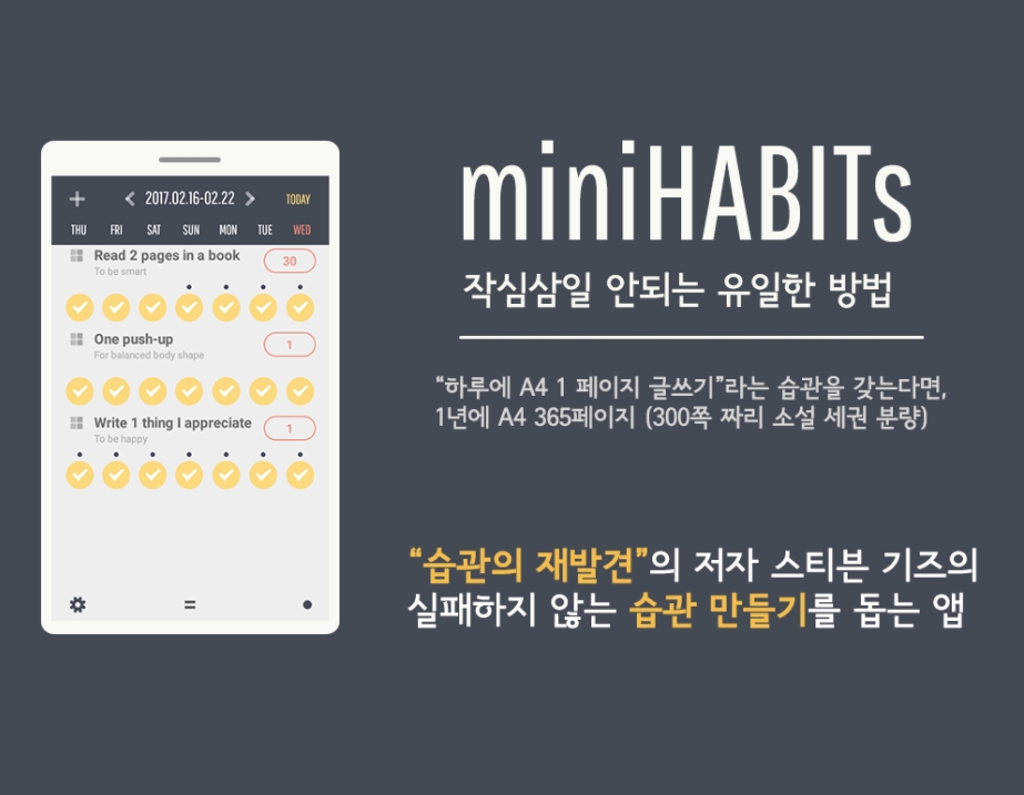 miniHABITs 앱을 통해 작은 습관 만들기 훈련을 익힐 수 있습니다.