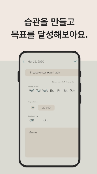 ▶ 좋네요~ 다른 습관 앱 많지만, 예쁜 디자인이랑 메모 기능을 보고 구매했습니다! 메모를 모아서 볼 수 있다는 점이 마음에 들어요! 앞으로 다양한 기능 업데이트 기대할게요^^