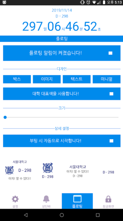 ▶ 매우 잘 쓰고 있어요. 다만 아쉬운 점은 d-day를 직접 설정해 상단바에 고정시킬 때 심플 모드를 사용하면 원하는 대학 로고 사진(왼쪽)과 디데이(오른쪽)가 함께 나왔으면 좋겠어요. 수능 디데이 심플모드를 설정했을 때 상단바에 나오는 것처럼요.