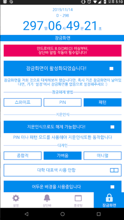 자신이 설정한 대학, 목표와 랜덤 하게 나오는 명언, 남은 디데이 등 모두 잠금 화면 안에 표시가 됩니다.