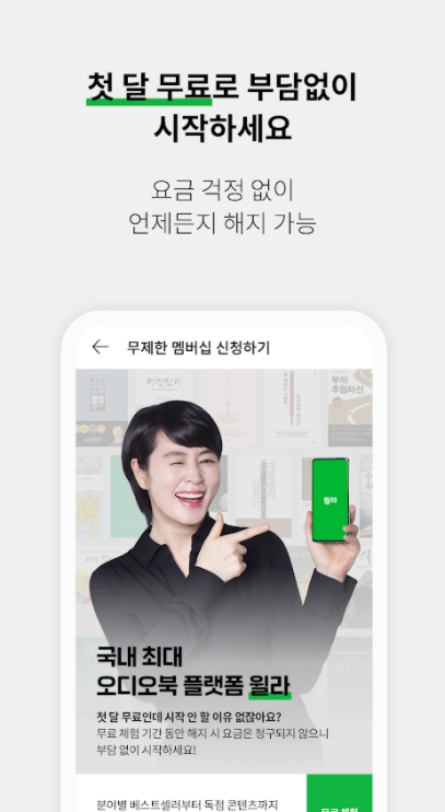 최신 베스트셀러는 물론 분야별 전문 지식과 윌라 독점 콘텐츠까지, 언제 어디서든 오디오북과 강의를 무제한으로 즐겨보세요. 해지도 간편한 첫 달 무료 이용으로 부담 없이 시작하세요!