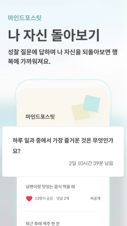 ‘마인드 포스트잇’은 자신을 돌아보게 만드는 질문을 던져요. 잠시 잊고 있었던 가치들을 돌아보게 하죠. 3일에 한 번씩 새로운 질문이 올라오니 기대해 주세요!