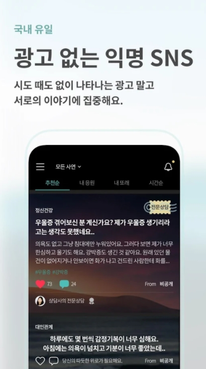 ▶ 진짜 저에게 큰 힘이 되는 앱이에요. 항상 힘들 때마다 글을 올리면 사람들도 저에게 공감을 해주고 응원의 말까지 해줘요. 정말 이 앱을 만드신 분께 정말 감사드려요. 이 앱을 쓸 때만큼은 우울증이고 뭐고 다 사라지는 것 같아요. 그리고 덕분에 저도 보이는 글마다 응원의 댓글을 쓰게 되고 정말 뿌듯하고 기분이 좋아요. 감사합니다.